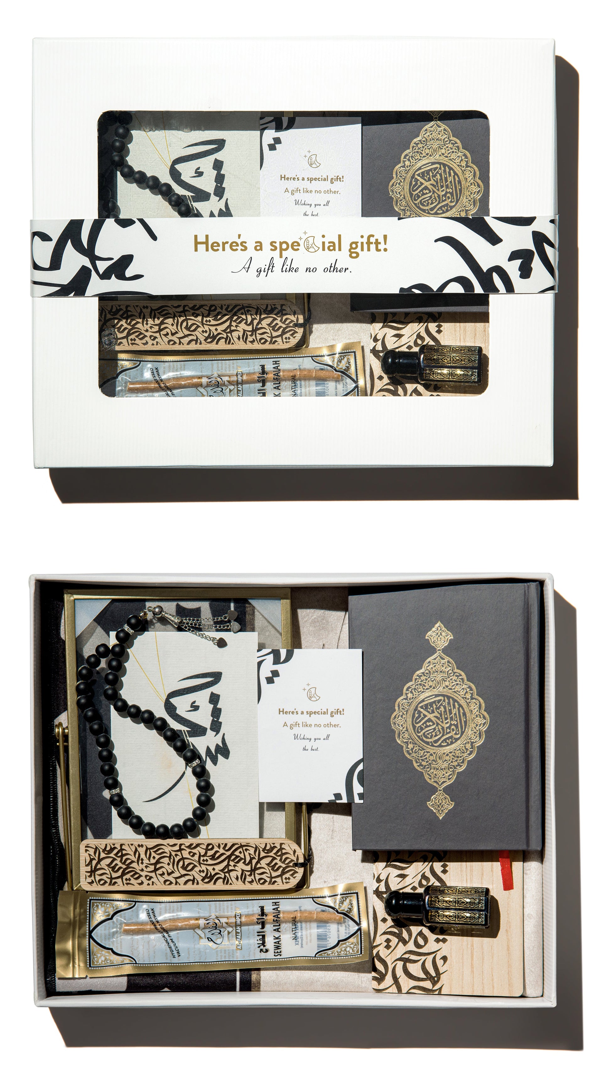 This Calligraphy Islamic Gift Box is a perfect choice for those who appreciate the elegance of calligraphy and the richness of Islamic tradition. Featuring beautifully crafted calligraphy designs alongside essential Islamic items, this box offers a unique blend of practicality, artistry and spirituality. Whether for personal use or as a thoughtful gift, the Calligraphy Islamic Gift Box has got everything you need.